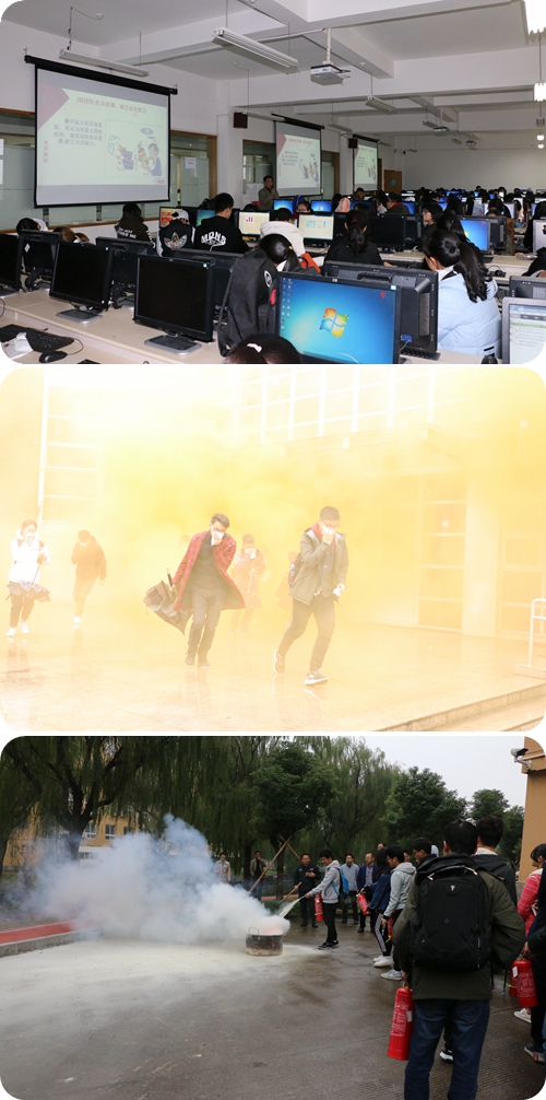 组织了一场模拟消防逃生演练。演练在严信才楼304机房进行,有近百余名师生共同参与。首先分管院长符院长做总动员,他强调了掌握消防知识和逃生演练的重要性,随后保卫处徐老师具体为学生讲解了遇到火灾如何报警、如何逃生自救、在逃生过程中注意事项等消防常识;介绍了逃生知识和技巧,并使学生意识到开展消防逃生演练的重要性和必要性。演练正式开始,工作人员已经点燃烟雾器,橙色的烟雾弥散了整个楼道,制造了“火灾现场”。火警警报拉响,师生们在准备逃离火场时,纷纷按照徐老师的方法进行自救,并在其他老师的协助下,逃离“火灾”现场,迅速地向安全地带转移,整个过程紧张而有秩序,最终所有师生安全地撤离。
