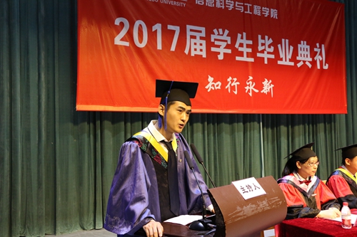表彰了2016、2017年度的“最美信息人”获奖者后,高尚超、张慧慧同学分别代表研究生、本科毕业生发言,感谢母校栽培之情,师长教育之恩。教师代表郭立君老师上台发言祝福毕业生们放飞梦想。