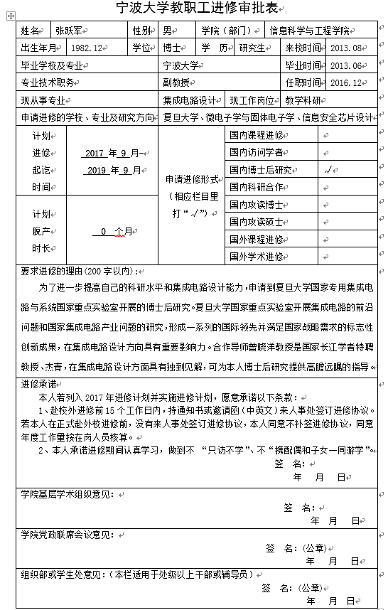 张跃军同志符合学校教职工进修的有关规定,经2017.9.7院党政联席会议审议,同意补报进修计划。根据学校规定现予公示,全院教职工见榜后有不同意见和看法请于9月10日(周日 )前反馈给夏银水院长、林奇凯书记。