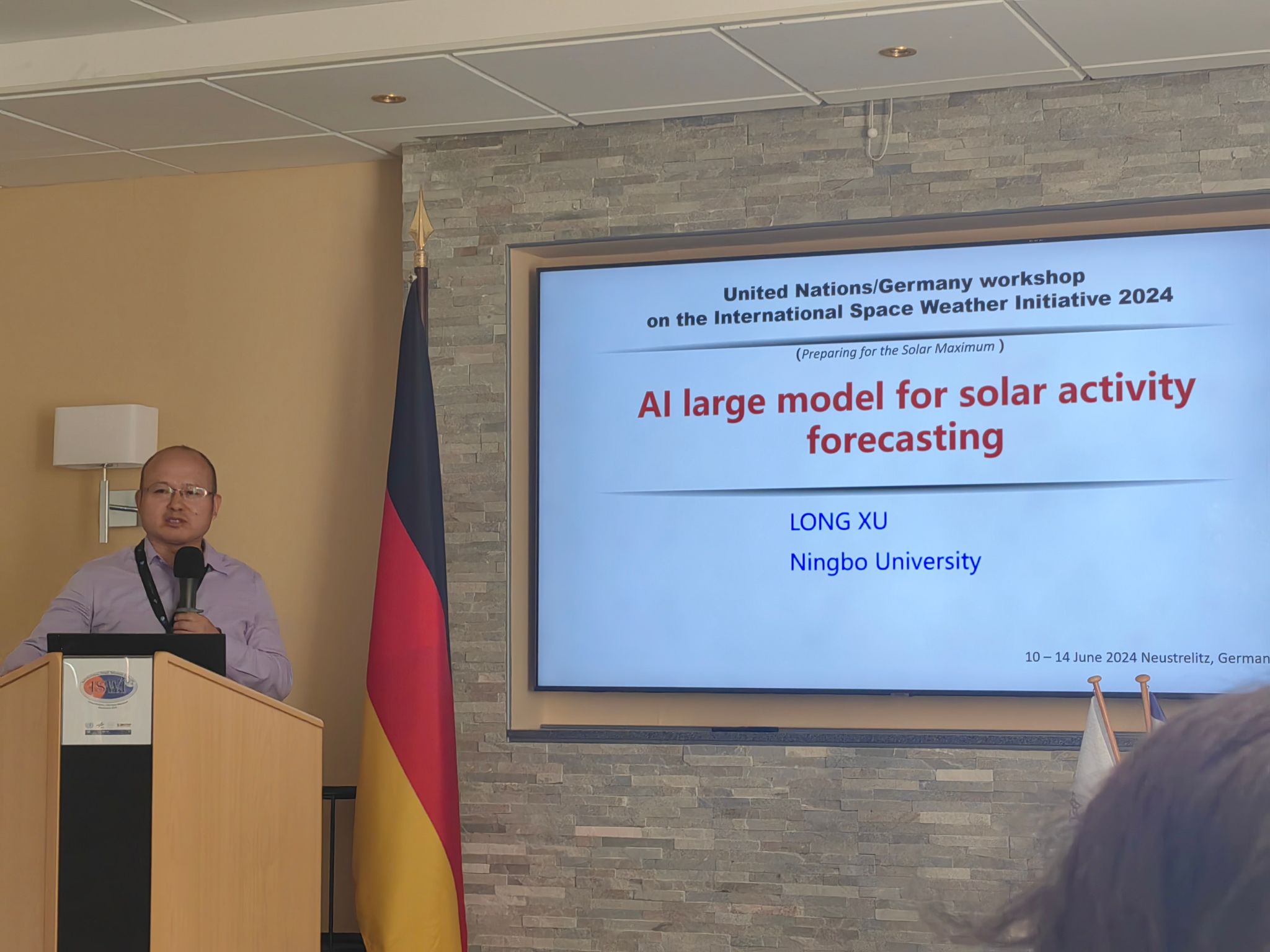 徐龙教授出席了在德国新施特雷利茨市举行的 “国际空间天气倡议:迎接太阳活动极大年”研讨会。此次会议恰逢第24太阳活动周极大年前夕,是一次全球空间环境领域备受瞩目的重要会议,旨在召集全球空间科学领域顶尖科学家与学者,共同探讨太阳活动极大年对地球空间环境的深远影响,并探索有效的应对策略。