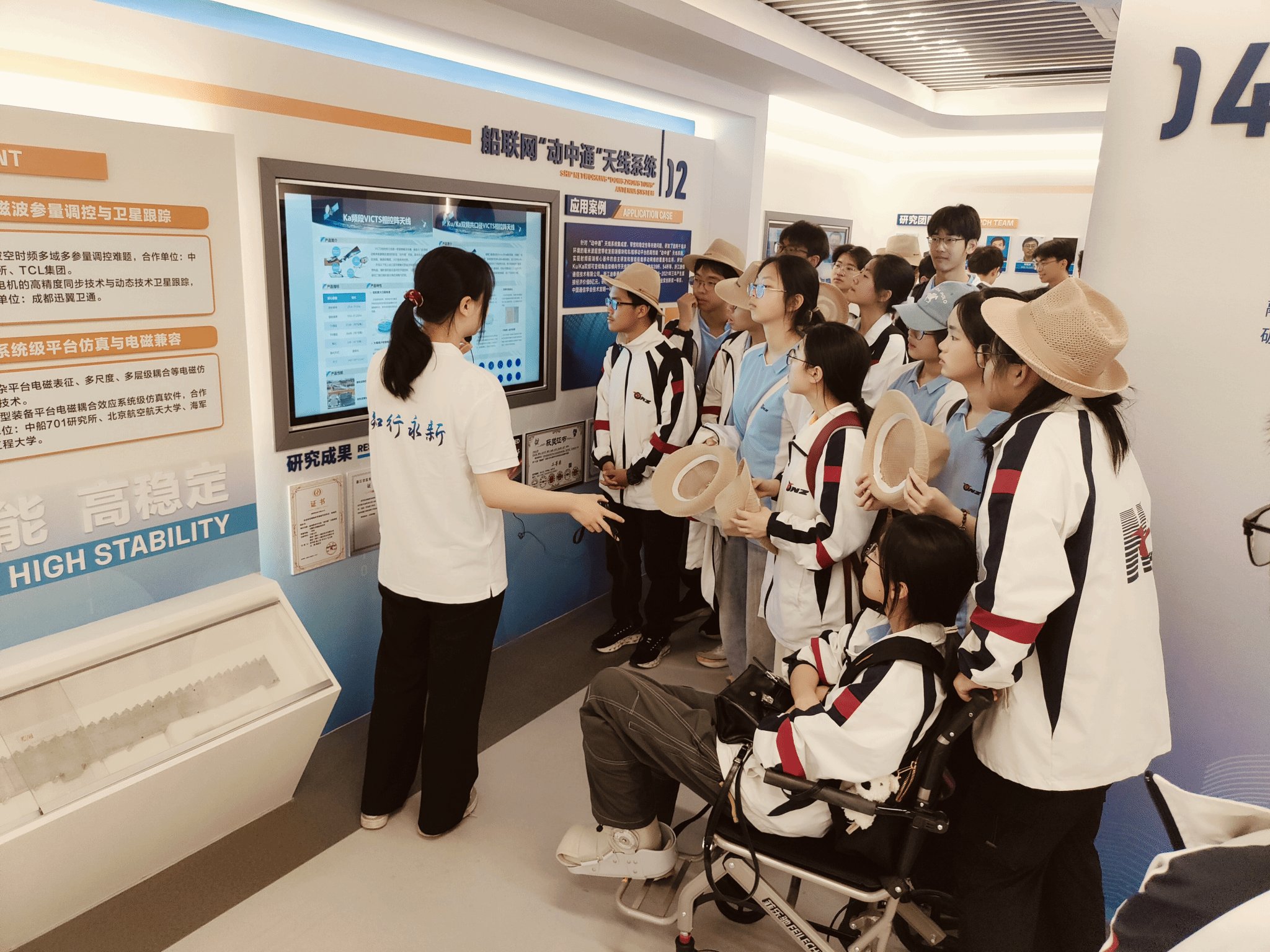 在船联网“动中通”展区,同学们了解了自研智能波束赋形技术在海上通信中的应用。该系统实现Ku/Ka双频切换,使海上数据传输速率提升至原来的3倍,即使在跨洋航行中也能稳定支持高清视频会议。在强电磁干扰环境下依然保持高传输准确率,同学们意识到了其作为未来海洋数字经济关键支撑的核心价值。
