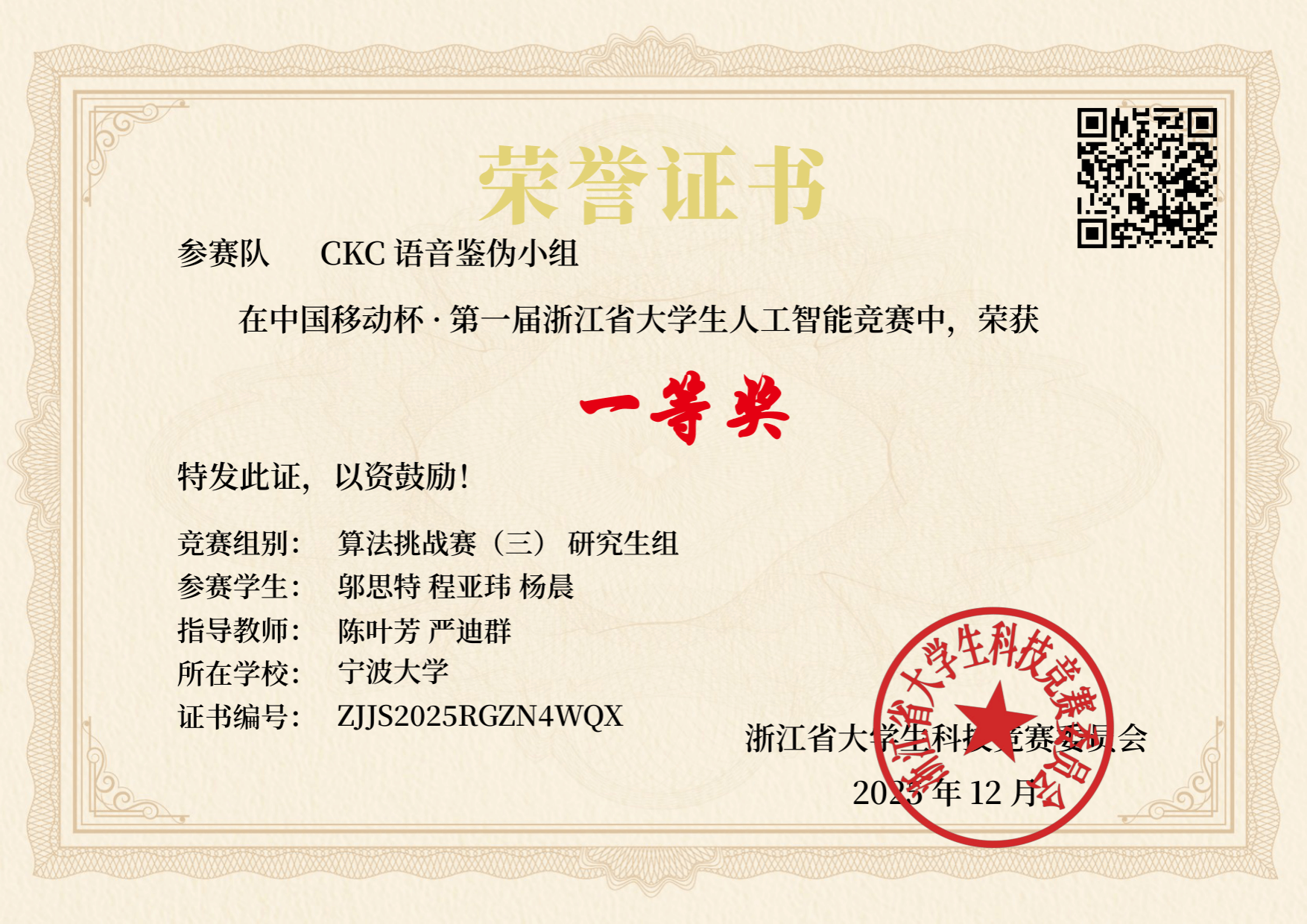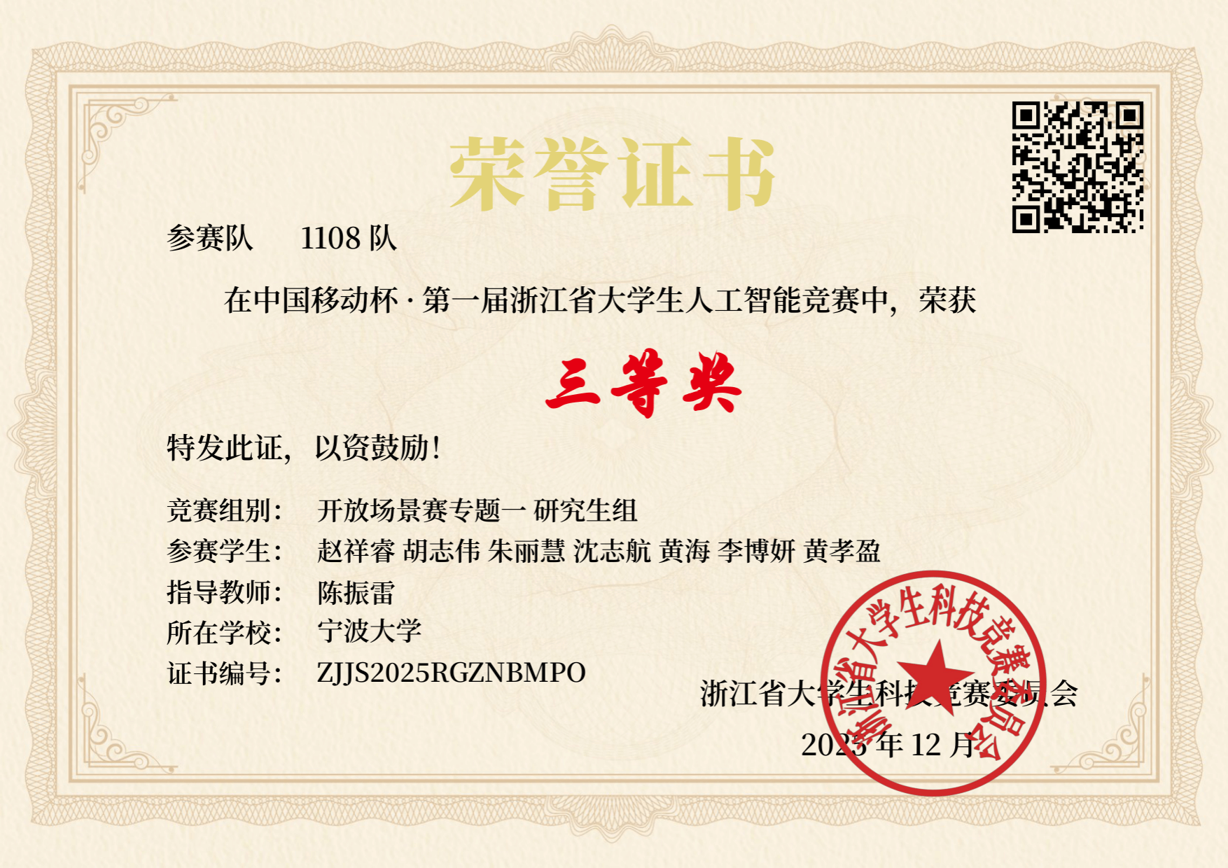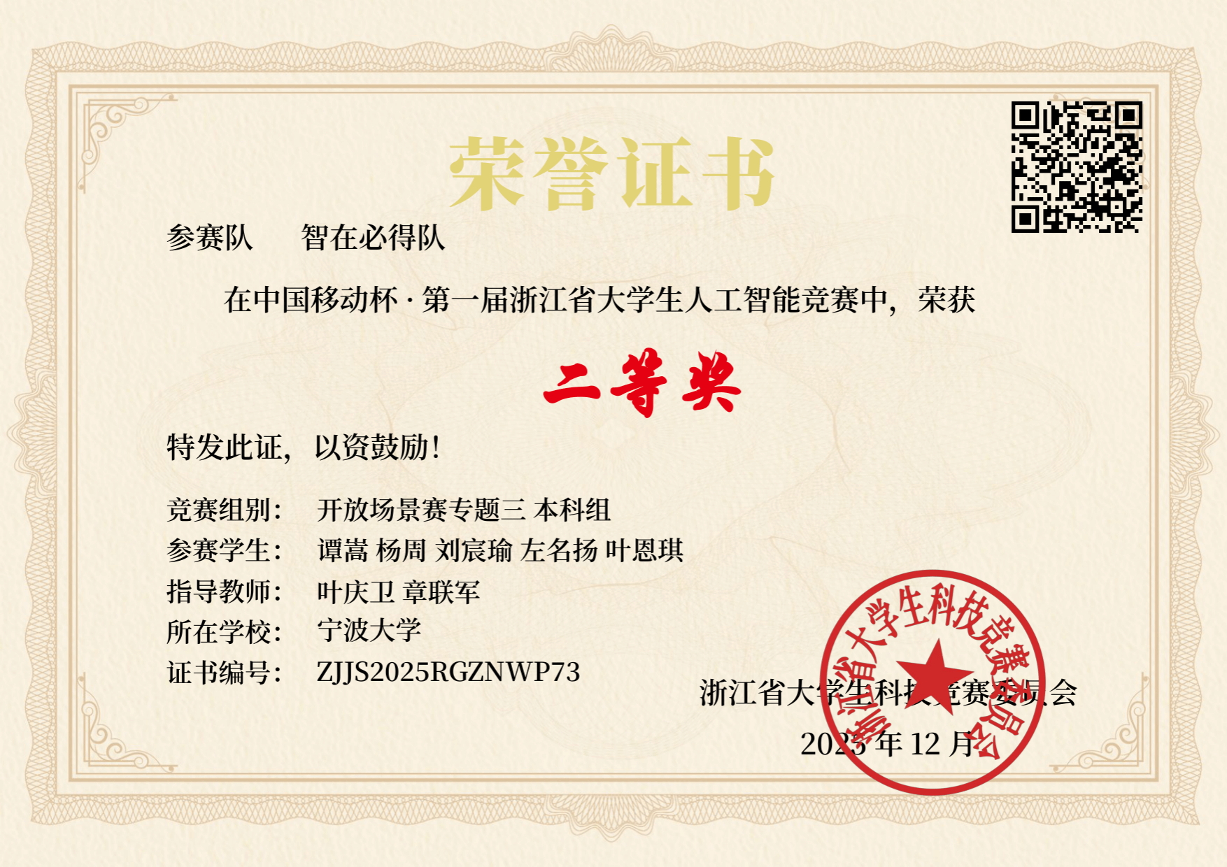近日,中国移动杯.第一届浙江省大学生人工智能竞赛在杭州落下帷幕,本场比赛由浙江省大学生科技竞赛委员会主办,由杭州电子科技大学承办,共有 1036 支参赛队参加预赛,最终共有 332 支参赛队入围决赛。我校选派的队伍在亚洲色吧