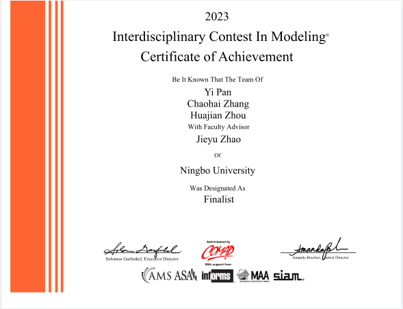 学子表现突出获得F奖(Finalist)3项,M奖(Meritorious Winner)2项,H奖(Honorable Mention)10项。 其中,获得F奖的分别为赵杰煜、陈瑜老师指导的由潘奕、张朝海、周华建组成的团队,江先亮老师指导的周子建、李德楠、余亦骏组成的团队,陈叶芳老师指导的梁航锋、姚志昊、赵罗曼组成的团队。