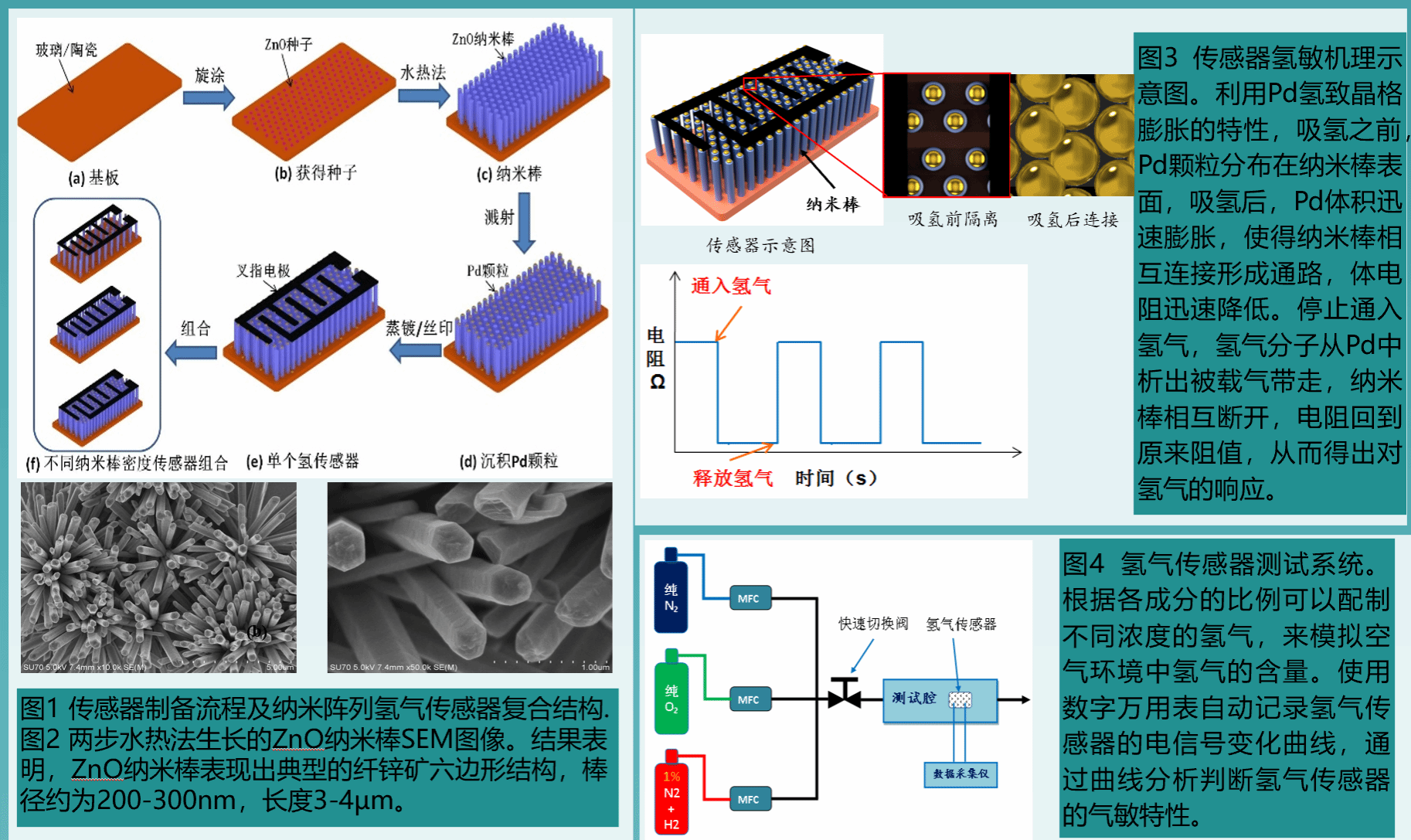 氢气是一种清洁高效的能源,氢气泄漏的检测是氢安全的必要条件。当空气中氢气的体积含量在4%-75%范围内时,遇明火或高温将会发生爆炸。开发一种响应快,稳定可靠的常温氢气传感器是氢能源广泛使用的必要前提。本团队提出了一类基于贵金属钯的新型氢传感器,此类传感器采用钯及钯合金纳米颗粒为敏感材料,敏感过程中基于金属的氢致晶格膨胀效应(HILE),利用钯吸氢前后的体积变化,导致Pd颗粒之间间隙的变化,最终通过检测通路的电学特性变化获得氢气浓度值。
