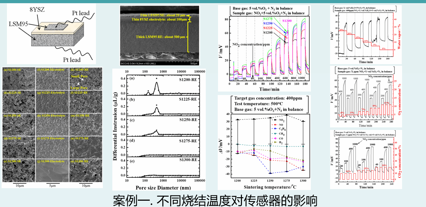 生物化石燃料燃烧产生的COxNOxSO2等有害气体,是形成酸雨、光化学烟雾、雾的主要成分之一。使用在线式尾气后处理系统是减少这类有害气体排放的有效方法。随着环保需求的增强,对尾气后处理系统的净化能力提出了更高的要求。与红外光谱仪、气相色谱等精密仪器相比高温气体传感器具有耐高温、成本低、结构简单、使用方便、可连续在线检测等优点,因此制备高性能在线式高温气体传感器是提高尾气后处理系统净化能力的前提和保证。在各类高温气体传感器中,基于高温固体电解质的电化学气体传感器(固体电解质气体传感器)因具有化学稳定性强、机械强度高、制作成本低等优点而被广泛应用于高温高湿的恶劣环境中;其中用于控制汽车尾气排放的汽车氧传感器就是这类传感器的典型代表,该类传感器的应用极大地减少了汽车尾气污染物的排放。采用流延、叠层、共烧等方法制备了薄LSM95传感电极。将不同温度下烧结的传感器灵敏度和选择性进行比较,结果表明,在1225℃烧结的传感器具有良好的灵敏度(40.71 mV/decade)和优异的选择性。此外,还发现该传感器响应具有很高的抗水蒸气、氧和二氧化碳的性能。采用激光刻蚀法对YSZ基板进行表面修饰,可提高YSZ基电化学氧传感器的灵敏度、选择性,降低检测下限、响应恢复时间等。