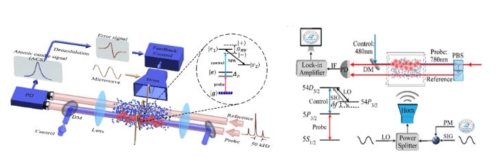 我们实现了基于里德堡原子的原子蜡烛,并展示了里德堡原子蜡烛从微波C波段到Ka波段的频率调谐性,100 Hz的大稳定带宽以及对噪声超两个量级的抑制效果。里德堡原子蜡烛的实现为自由空间的微波应用提供了良好的前景,如精确测量材料的特性,如吸收和折射率,实现基于微波的远距离环境监测。该研究成果已发表于Frontiers of Physics 18, 12302 (2023)。我们采用频分复用和空间分复用技术以增加原子接收机的信道数,从而提高其信道容量。该研究成果已发表于Physical Review Applied 19(4), 044079 (2023)。
