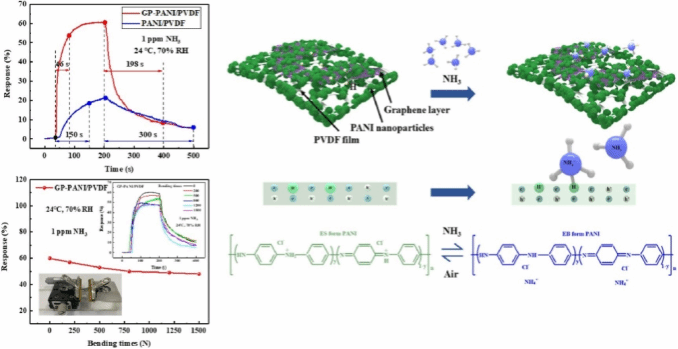 以陶瓷氧化铝为衬底的传统金属氧化物半导体气敏传感器功耗高且难以实现柔性化和可穿戴设备集成,近年来团队主要集中在柔性导电聚合物基室温气敏传感器及其阵列结构和电子鼻系统优化研究上,并为进一步的技术推广和成果转化提供了很好的实验探索和理论基础。主要采用喷墨打印方法在柔性衬底上进行导电聚合物基复合氨敏薄膜的制备和可控掺杂,结合石墨烯或碳纳米管等分层多孔结构设计和有机酸改性等手段,针对响应气体的灵敏度特性、选择性、一致性、器件稳定性和气敏机理等方面展开系统研究,优化气敏传感阵列单元并进一步实现电子鼻系统,对气体响应信号进行神经网络训练实现定性定量识别。该类柔性氨气电子鼻系统在人体呼气监测和健康预警上具有良好的应用前景,主要研究成果已发表论文十余篇,