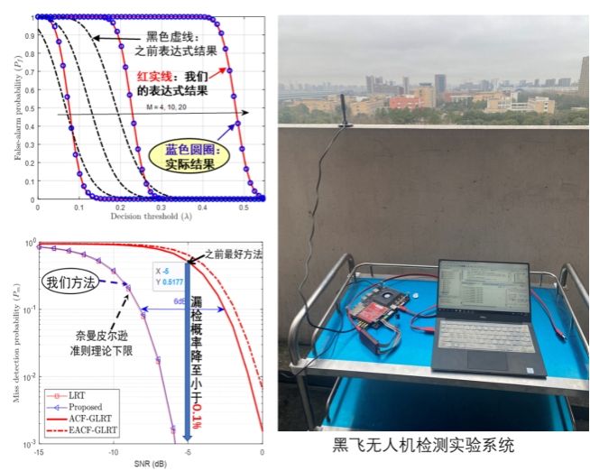 通过解耦相关系数、分析有序特征值和无序特征值联合统计分布函数、特征向量子空间匹配量的统计分布函数等手段,建立了准确计算判决门限的数学解析表达式,解决了国际上基于协方差矩阵检测方法面临的判决门限快速设置问题;研究无线电信号特征,有效利用多维信号子空间,提高了无线电信号检测性能。系列成果发表于IEEE Transactions on Signal Processing、IEEE Transactions on Wireless Communications、IEEE Internet of Things Journal等期刊论文60余篇。相关成果应用于黑飞无人机检测,在校园强Wi-Fi信号干扰环境下,实现远距离检测。