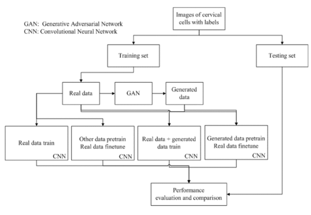 在医学图像分类中,类不平衡问题较为普遍。通常异常样本数量远小于正常样本数量。项目团队利用生成对抗网络,生成异常样本,检查生成样本的特性,并设计样本融合策略,训练深度神经网络模型。模型的测试结果验证了生成样本用于处理类不平衡问题和改善分类器性能的有效性。Yu S, Zhang S, Wang B, Dun H, Xu L, Huang X, Shi E, Feng X. Generative adversarial network based data augmentation to improve cervical cell classification model. Math Biosci Eng. 2021 Feb 8;18(2):1740-1752.