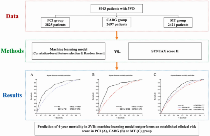 该研究结果发表在国际权威杂志《Atherosclerosis》,研究入选患者来自于阜外医院8943例冠脉三支病变患者。该研究分别在PCI组、CABG组和药物组利用机器学习特征选择方法评估特征参量重要性,并使用随机森林方法建立冠脉三支病变患者死亡风险预测模型,在和Syntax积分(根据冠状动脉病变解剖特点进行危险分层的积分系统)的对比中显示,本研究给出的冠脉三支病变患者危险分层预测效果显著提高。(Feng X, Zhang C, Huang X(共同一作), Liu J, Jiang L, Xu L, Tian J, Zhao X, Wang D, Zhang Y, Sun K, Xu B, Zhao W, Hui R, Gao R, Yuan J, Wang J, Duan Y, Song L. Machine learning improves mortality prediction in three-vessel disease. Atherosclerosis. 2023 Feb;367:1-7)