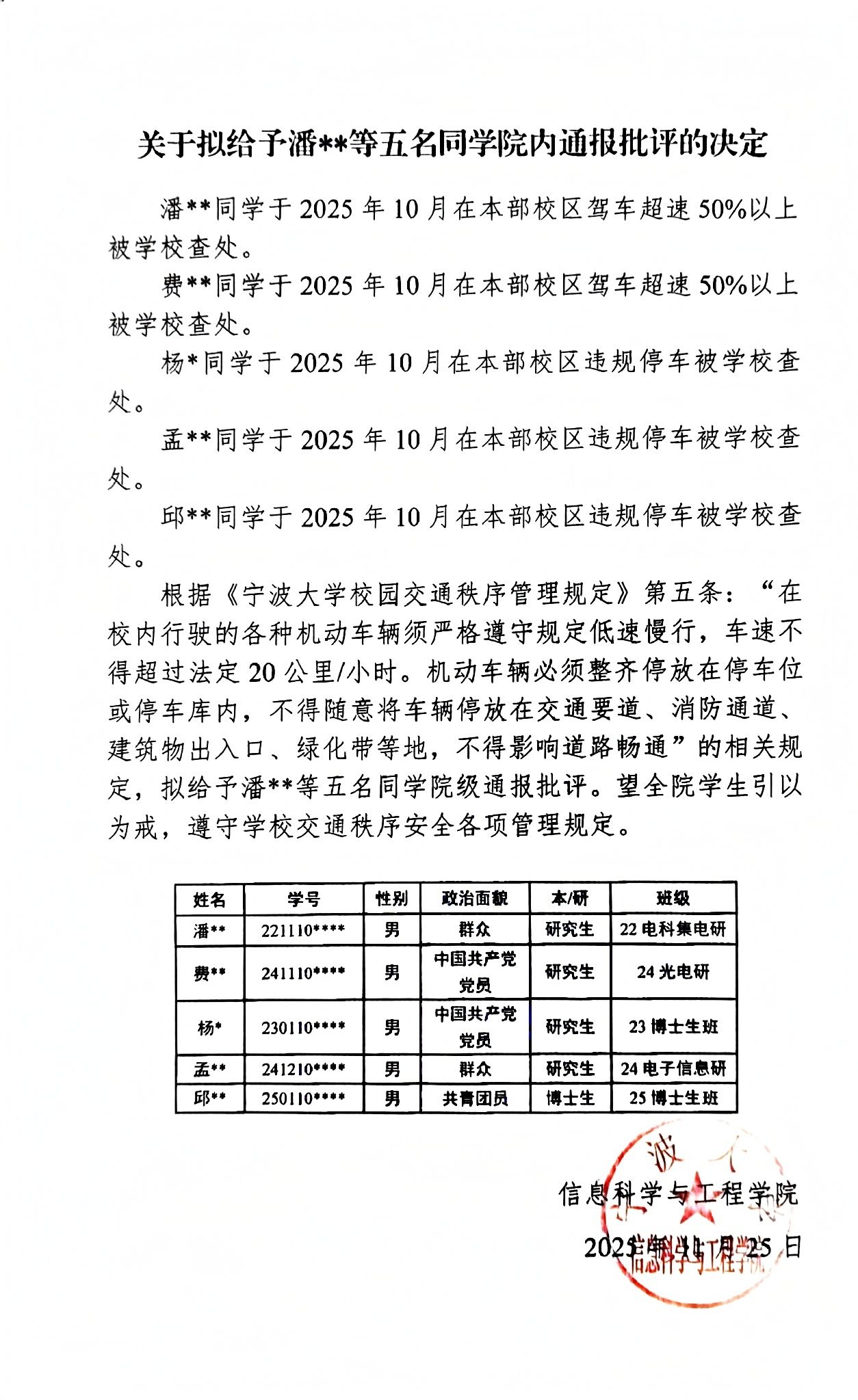 关于拟给予潘**等五名同亚洲色吧 内通报批评的决定