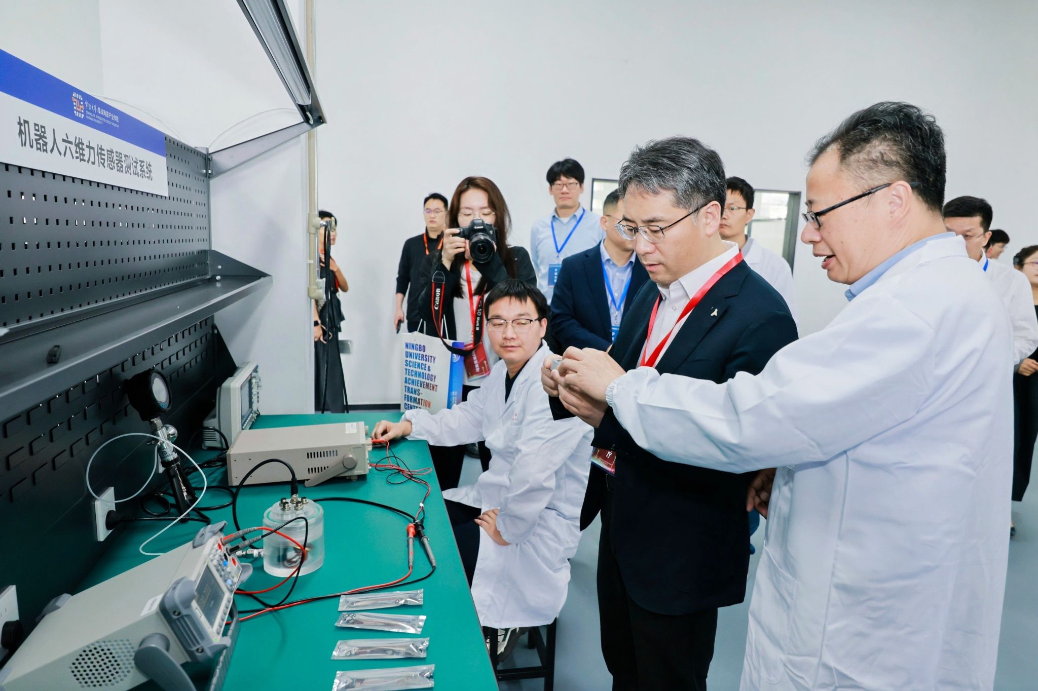 入驻团队代表、先进智能传感技术团队负责人金庆辉教授带领陈峰一行参观团队研发工作区。该团队是从事国内气体传感器、微纳传感器的创新科研团队。主要在机器人六维力传感器技术、新能源车动力电池状态传感技术等方面有诸多技术突破,承担了多项军委科技委、国家科技部重大专项项目。该团队近几年积极服务智能制造相关产业需求,与中国一汽车集团有限公司、宁波水表集团、宁波均胜电子汽车研究院等多家单位开展产学研工作,已独立孵化宁波九章电子有限公司助力成果转化,为产业发展注入宁大智慧。